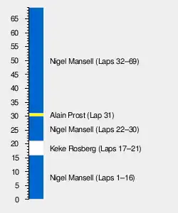 The 69-lap race was won from pole position by Briton Nigel Mansell, driving a Williams-Honda. Frenchman Alain Prost finished second in a McLaren-TAG, with Mansell's Brazilian teammate Nelson Piquet third. Prost took the lead of the Drivers' Championship by two points from Mansell and another Brazilian, Ayrton Senna, who finished fifth in his Lotus-Renault.
