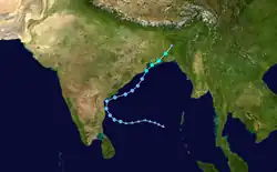 A tropical disturbance slowly organized into a tropical depression on November 6 in the Bay of Bengal. It turned to the northeast, became a tropical storm, and reached a peak of 60 mph winds before hitting Bangladesh on the 9th. The storm dissipated on the 10th, after causing 11 casualties and heavy damage.