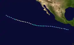 Activity in the Eastern Pacific Hurricane Center's (EPHC) area of responsibility was above average. There were 25 tropical depressions, one short of the record set in 1982, which had 26.[2] Only one system formed in the Central Pacific Hurricane Center's (CPHC) area of responsibility, and six others entered the CPHC area of responsibility from the EPHC area of responsibility.[3] In all, 17 systems formed, which is two storms above normal. In addition, 9 hurricanes were reported during the season, one more than average. An average number (3) of major hurricanes – Category 3 or higher on the Saffir-Simpson hurricane wind scale—was also reported.[4][5]