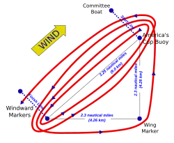 The orientation of the course was set such that the starting line was square to the prevailing wind 20 minutes before each race start. Races were 24.3 nautical miles (45.0 km) long, consisting of beats into the wind in legs 1, 3, 6 and 8; downwind runs on legs 2 and 7; and reaches on legs 4 and 5.[21]