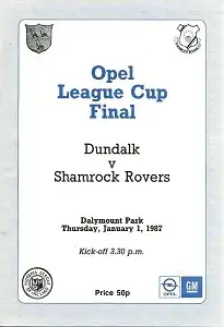 The League Cup was the first trophy of the 1986–87 League of Ireland season. Its first round, in which four teams played each other in a double round-robin system, took place before the start of the league schedule. The two sides had met twice already that season, with Shamrock Rovers winning both the President's Cup final and the league fixture in Milltown.[1] Dundalk had last won the competition in 1981. They reached the final by topping their group over Cork City, Drogheda United and EMFA, and then defeating St Patrick's Athletic (in a penalty shoot-out after a 0–0 draw) and Athlone Town (1–0).[2]
