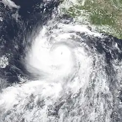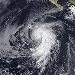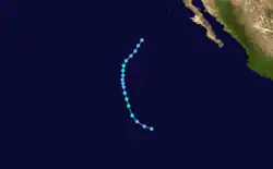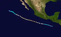 Otis originated from the a tropical disturbance embedded in the monsoon trough. It moved over the warm waters south of the Mexican Riviera from September 17 to September 19. At 0000 UTC September 20, the disturbance was upgraded into Tropical Depression Nineteen-E while moving to the northwest.[5] It strengthened into a tropical storm later that day while located 950 mi (1,530 km) southwest of La Paz.[3] Eighteen hours later on September 21, Otis intensified into a hurricane.[5] It also began to turn back to the west and began to undergo a period of rapid deepening. On September 22, Otis reached its peak windspeed of 115 mph (185 km/h).[5] It would oscillate irregularly between that strength and Category 2 intensity until September 24.[3] That day, it began accelerating to the west as it lost strength due to increased wind shear and decreasing ocean temperature.[5] Otis fell to tropical storm strength on September 25 and a depression on September 26, and dissipated shortly after that.[3]