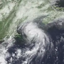 On September 2 a cluster of thunderstorms associated with a northwestward-moving tropical wave developed a surface low near Bermuda. Though the surface low remained poorly defined and separate from the convection, the system became a tropical depression on September 3.[40] Under the influence of southwesterlies, the depression accelerated northeastward at 50 mph (80 km/h). Late on September 3 it was upgraded to Tropical Storm Ernesto. The storm continued to strengthen as it lost tropical characteristics.[41] A large extratropical storm over the North Atlantic absorbed Ernesto on September 5. The only land area affected by the storm was in the Azores, where it brought near storm-force winds to Flores Island.[6]