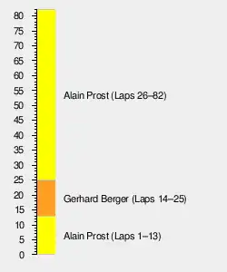 Behind the McLarens, Piquet was maintaining third ahead of the Williams pair of Patrese and Mansell. The Italian opened a small gap on his teammate and closed on Piquet, making several attempts to pass the Brazilian. However, he spun on lap 53, letting Mansell past. The Englishman was no more successful in trying to pass Piquet, and he retired on lap 66 when his brakes failed and he spun into the wall. By lap 59 Prost was putting in a succession of fast laps, extending his lead to over 30 seconds and lapping the whole field up to the fifth-placed Rial of Andrea de Cesaris.