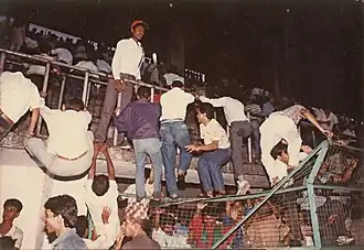 The Dasharath Stadium Disaster occurred on 12 March 1988 at the Dasharath Stadium in Kathmandu, Nepal during a football match between the Janakpur Cigarette Factory and Bangladeshi side Muktijoddha Sangsad KC for the 1988 Tribhuvan Challenge Shield.[1][2] 93 people were killed and more that 100 were injured in a stampede when spectators trying to flee from a hailstorm rushed to the locked doors of the stadium.[1] The Dasharath Stadium disaster was the 9th biggest stadium disaster until 2006 and the worst stadium disaster in Nepal.