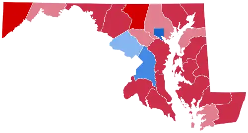 As of 2024, this remains the last time that the Republican presidential candidate has won the state of Maryland, as well as Baltimore County and Howard County.[4] Maryland was one of only two states that Bush carried in 1988 which had voted for Jimmy Carter in 1980, the other being Carter's home state of Georgia.[5] This also marks the only occasion since 1952 in which Maryland has given an outright majority to a non-incumbent Republican.
