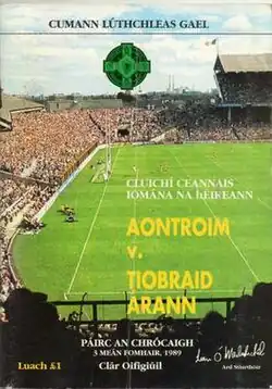 The 1989 All-Ireland Senior Hurling Championship Final was the 102nd All-Ireland Final and the culmination of the 1989 All-Ireland Senior Hurling Championship, an inter-county hurling tournament for the top teams in Ireland. The match was held at Croke Park, Dublin, on 3 September 1989, between Tipperary, managed by Bab's Keating and Antrim, managed by Jim Nelson. The game was shown live in Ireland on Network 2 with match commentary provided by Ger Canning and comments throughout provided by Jimmy Magee. The Ulster champions lost to their Munster opponents on a score line of 4-24 to 3-9.[2]