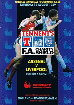 Arsenal qualified for the 1989 FA Charity Shield as winners of the 1988–89 Football League First Division.[8] The team played Liverpool at Anfield in the final game of the season and needed to win by two clear goals to be crowned champions.[9] Alan Smith scored for Arsenal early in the second half to make it 1–0, and Michael Thomas's goal with seconds left of the match ensured the team won the league title.[9] Liverpool, days before the league encounter with Arsenal, defeated Everton to win the 1989 FA Cup Final[10] which meant they obtained the other Charity Shield place.[8]