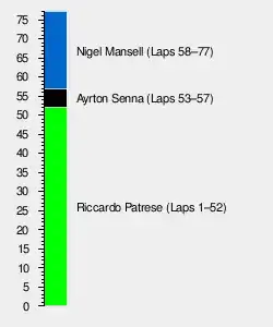 Mansell now began to pressure Senna, clearly faster but unable to pass due to the extra power of the McLaren's Honda engine. Meanwhile, Prost pitted for tyres and rejoined 6th, while Berger only inherited 3rd briefly before he retired with gearbox problems, leaving Senna and Mansell on their own. Eventually, the pair came up to lap Stefan Johansson's Onyx. Senna caught him at an awkward moment, just at the accelerating zone out of turn 3. The Brazilian uncharacteristically hesitated, briefly lifting off, and this allowed Mansell to draw alongside as they went past Johansson and then use the Ferrari's greater momentum to surge past Senna and take the lead. After that, Mansell had an unchallenged run to the flag, beating Senna by nearly 26 seconds, with Boutsen completing the podium. Prost overtook Eddie Cheever's Arrows for 4th on the final lap, while Nelson Piquet's Lotus rounded off the points scorers.[3]