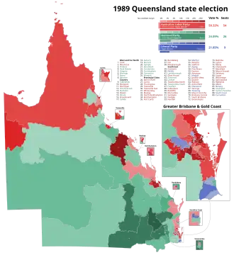 - ^ Australian Government and Politics Database. "Parliament of Queensland, Assembly election, 2 December 1989". Archived from the original on 18 January 2015. Retrieved 22 February 2009.