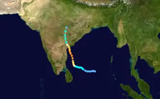 Over the next couple of days the system rapidly intensified before the JTWC reported early on 8 May, that the system had peaked with 1-minute sustained windspeeds of 230 km/h (145 mph), which made the system equivalent to a category 4 hurricane on the Saffir–Simpson hurricane wind scale.[2] At around the same time the IMD also reported that the cyclone had peaked as a Super Cyclonic Storm, with 3-minute sustained wind speeds of 235 km/h (145 mph) and an estimated central pressure of 920 hPa (27.17 inHg).[1] By this time the system was located about 150 km (95 mi) to the northeast of Madras and was moving northwards slowly.[1] Later that day as the ship Visvamohini moved through the systems eye region, it measured a central pressure of 912 hPa (26.93 inHg), which the IMD reported would be one of the lowest central pressures ever measured in the Bay of Bengal if it was correct.[1] The system subsequently weakened and had become a Very Severe Cyclonic Storm by the time it made landfall during 9 May, near the mouth of the Krishna River in southern Andhra Pradesh.[1][2][3] The system subsequently moved north-westwards and gradually weakened further, before it was last noted during 11 May, by both the IMD and JTWC.[1][2]