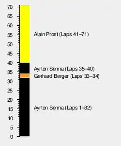 Prost was piling on the pressure, and by lap 35 he had climbed to second within 10 seconds of Senna, and was now ahead of Riccardo Patrese, Berger and Nelson Piquet. When Senna came up to lap former Lotus teammate Satoru Nakajima, there was contact and the McLaren had to pit for a new nosecone. He rejoined and challenged hard, but the reduced downforce levels made the car difficult to drive. On lap 66, Patrese retired with a broken oil cooler.