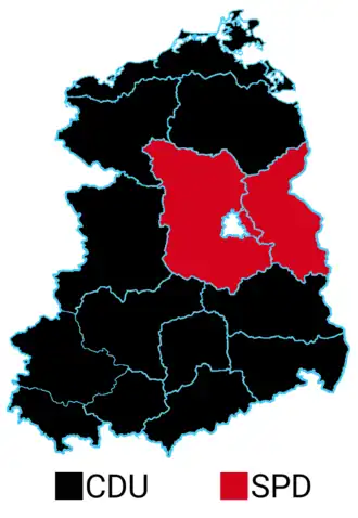| Magdeburg | 386,694 | 44.2 | 240,205 | 27.5 | 124,391 | 14.2 | 17,058 | 2.0 | 38,578 | 4.4 | 17,011 | 1.9 | 15,616 | 1.8 | 17,427 | 2.0 | 5,926 | 0.7 | 3,382 | 0.4 | 4,246 | 0.5 | 1,168 | 0.1 | 2,854 | 0.3 |