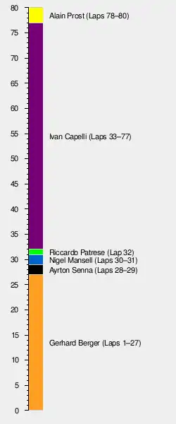 The win, Prost's third for the season, marked Ferrari's 100th race victory in Formula One, and closed the gap to championship points leader Senna to just three points.[1][2]