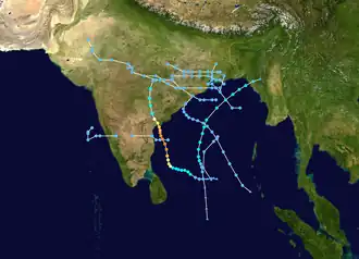 During the withdrawal phase of the south-west monsoon on October 7, the IMD reported that a depression had developed over the northern Bay of Bengal.[9] During that day the system moved north-westwards and made landfall on the coast of Odisha and West Bengal as a Deep Depression.[9] The system subsequently came under the influence of a westerly trough of low pressure and recurved towards the northeast, before it dissipated over West Bengal during October 9.[9] 370 deaths were recorded in Bangladesh in association with this system, while a storm surge affected Chittagong and caused extensive damage to two offshore islands.[10][11][14] A search and rescue operation was launched after 350 boats and trawlers failed to return to port and 5000 fishermen failed to return to port after the system.[11][14] On November 14, the IMD reported that a depression had developed out of a pre existing disturbance, that was located over the south-west Bay of Bengal near the Tamil Nadu Coast.[9] During that day the system moved westwards and made landfall on the Northern Tamil Nadu and Southern Andhra Pradesh coasts before it rapidly weakened into an area of low pressure.[9] The remnants subsequently crossed the Indian Peninsular and emerged into the Arabian Sea during November 16, before they intensified into a Deep Depression during November 17.[9] The system subsequently recurved towards the northeast, before the system dissipated over the sea during November 18.[9]
