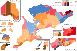 ![]() Popular vote by riding. As this is an FPTP election, seat totals are not determined by popular vote, but instead via results by each riding. Click the map for more details. | |||||||||||||||||||||||||||||||||||||||||||||||||