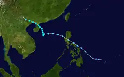 A tropical disturbance trekked across the Philippines in mid June, upon entering the South China Sea a depression formed. The depression was upgraded to Tropical Storm Nathan on June 16. Tropical Storm Nathan reached peak intensity of 65 mph (100 km/h) shortly before striking Hainan Island. In the South China Sea the Chinese ship Tien Fu sank killing 4 people. In southern China torrential rains caused flooding in Guangdong Province killing 10 people, two people drowned in Macau due to high waves. Tropical Storm Nathan then continued northwestwards making a final landfall near the Vietnam/China border.[3] The storm caused approximately 1.9 million RMB in damages (US$346,000).[5]