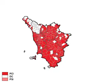 The Italian Communist Party was by far the largest party, but lost many votes from five years before. After the election Communist Marco Marcucci formed a government comprising the Italian Socialist Party and the Italian Democratic Socialist Party. In 1992 Vannino Chiti took over from Marcucci and the centre-right Italian Liberal Party joined the government.[1]
