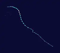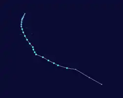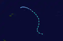 Early on December 8, the NWOC reported that Wasa had peaked with 1-minute sustained windspeeds of 195 km/h (120 mph), which made it equivalent to a category 3 hurricane on the SSHWS.[14] The next day, the FMS estimated peak 10-minute winds of 165 km/h (105 mph), making Wasa a Category 4 severe tropical cyclone.[5][14] Over the next few days, the system weakened into a tropical depression after passing through the Society and Austral Islands.[1][15] The NWOC issued their final advisory on Wasa on December 13, as the system turned northeastward to warmer waters.[13][14][15] Later that day, Wasa became sufficiently organized to be reclassified as a category 1 tropical cyclone by the FMS, who renamed it Arthur.[1] Over the next 24 hours, Arthur passed about 80 mi (130 km) north-northwest of Mururoa, which reported winds of 70 km/h (45 mph).[15] On December 14, the FMS reported that Wasa-Arthur had reached its secondary peak intensity of 130 km/h (80 mph).[1][15] The cyclone maintained this intensity while moving eastward through the uninhabited Acteon Group of islands and other atolls. On December 15, the NWOC classified it as Tropical Cyclone 08P, with peak 1-minute winds of 85 km/h (55 mph).[1][15][16][17] On December 16, the system gradually weakened into a shallow depression, and both the FMS and the NWOC issued their final advisories on Wasa-Arthur.[15]