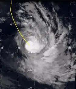 During March 24, the FMS reported that a tropical depression had developed within the South Pacific Convergence Zone and a favourable environment for further development, to the north of the Tuamotu Islands in French Polynesia.[1][49] During that day, the system gradually developed further with its convective cloud signature improving, as it moved slowly south-eastwards under the influence of a northerly environmental steering flow.[1][49] During the following day, the NPMOC and the FMS reported that the depression had developed into a tropical cyclone, with the latter naming it as Hettie after gale-force wind speeds had wrapped around the system's centre.[1][16] After being named, Hettie gradually intensified further as it moved south-eastwards and passed in between Tahiti, Hereheretue and Nukutepipi during March 26.[49][50] During March 27, the FMS reported that the system had peaked with estimated 10-minute sustained windspeeds of 85 km/h (50 mph), while it was located about 150 km (95 mi) to the southwest of Hereheretue.[1] This was followed by the NPMOC later that day, who estimated that Hettie had peaked with 1-minute peak sustained windspeeds of 100 km/h (65 mph).[49][50]