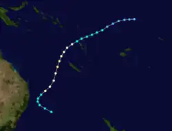 On February 24, a shallow tropical depression developed within the monsoon trough of low pressure, about 370 km (230 mi) to the northeast of Port Vila, Vanuatu.[35] Over the next day the system moved south-westwards and gradually developed further, before it passed over northern Vanuatu between February 25–27.[35][11] During February 26, the JTWC and the FMS reported that the depression had developed into a tropical cyclone, with the latter naming it as Easu, while it was located to the east of Espiritu Santo in Vanuatu.[13][35] Throughout that day as Esau intensified further, it moved south-westwards and away from the islands of Vanuatu.[35] Esau subsequently accelerated westwards to the north of an intense subtropical ridge of high pressure and gradually intensified further as it moved into an area of decreasing vertical windshear.[1] During February 28, the FMS subsequently reported that the system had peaked as a category 4 severe tropical cyclone with 10-minute sustained wind speeds of 185 km/h (115 mph).[1][36] The system subsequently moved into the Australian region and brought gale-force winds to the Solomon Islands during February 29.[1] The JTWC also reported that Esau had peaked with 1-minute sustained wind speeds of 240 km/h (150 mph), which made it equivalent to a category 4 hurricane.[36] Over the next few days the system moved south-eastwards and back into the South Pacific basin, under the influence of a northwest steering flow and threatened the southern islands of Vanuatu.[35] The system subsequently came to within 450 km (280 mi) of southern Vanuatu before turning southwards and threatening the French overseas territory of New Caledonia.[35] The system made landfall on the French territory of New Caledonia during March 4, as a category 3 severe tropical cyclone.[35] As a result of passing over the mountainous island nation and increasing vertical wind shear, the system transitioned into an extratropical cyclone over the cooler waters of the Tasman Sea.[35] The extratropical remnants of Cyclone Esau subsequently made landfall on New Zealand's North Island during March 8, before they were last noted during the next day over the South Pacific Ocean.[37]
