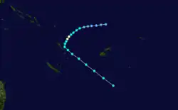On November 13, the FMS started to monitor a tropical depression that had developed within the South Pacific Convergence Zone, to the northeast of the Solomon Islands.[4][8] Over the next few days, the system gradually developed further within an area of light winds in the upper troposphere, before the JTWC initiated advisories and designated it as Tropical Cyclone 03P early on November 15.[9][10] During that day the system's upper-level outflow characteristics became more favourable for further development, before the FMS named the system Tia early the next day after it had developed into a Category 1 tropical cyclone.[4] Later that day because of a developing northerly steering current, the system slowed down and undertook a small anticlockwise loop before starting to move towards the southwest and rapidly intensify. After rapidly intensifying throughout November 16 and 17, Tia passed within 55 km (35 mi) of Anuta Island at around 1800 UTC on November 17, before passing near Tikopia Island six hours later. As Tia moved near Tikopia, the FMS reported that the system had reached its peak intensity as a category 3 severe tropical cyclone with 10-minute sustained windspeeds of 140 km/h (85 mph).[4] During November 18, Tia started to gradually weaken under the influence of cooler sea surface temperatures and strengthening vertical windshear, while it moved southwards under the influence of a strengthening upper level northerly wind flow.[1][8] Over the next 24 hours, the system continued to move southwards and passed within 150 km (95 mi) of Vanuatu's Banks Islands, while gradually weakening further.[4] Tia subsequently degenerated into a tropical depression during November 20, before it was last noted during the next day, as it crossed a part of its former track where it had been producing hurricane-force windspeeds a few days earlier.[4][10]