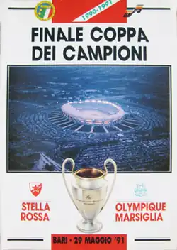 The 1991 European Cup final was a football match held at the Stadio San Nicola in Bari, Italy, on 29 May 1991, that saw Red Star Belgrade of Yugoslavia[a] defeat Marseille of France in a penalty shoot-out. After normal time and extra time could not separate the two sides, the match was to be decided on penalty kicks. Manuel Amoros's miss for the French side proved crucial, as Red Star held their nerve to win their first European Cup title. As of 2025, this remains the last European Cup final that both clubs were making their debut appearances in the competition's final.