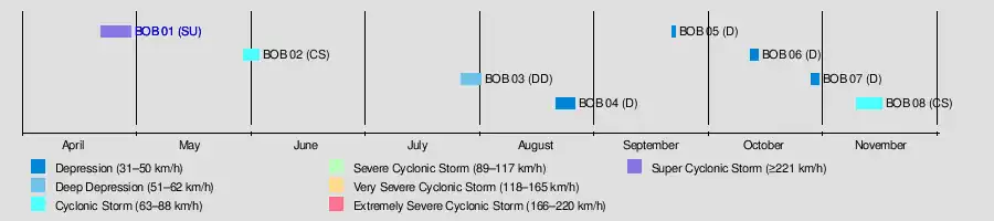 BOB 01, tracked by the Joint Typhoon Warning Center as 02B, hit Bangladesh on April 29 as a strong cyclone.[4] It brought a tremendous storm surge and massive wind damage, resulting in the deaths of over 138,000 people. BOB 01 was the deadliest cyclone on Earth since the 1970 Bhola Cyclone. It also destroyed an estimated 1 million homes, leaving as many as 10 million people (a substantial portion of the country's population) homeless.