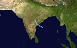 Early on August 22, reported that Depression BOB 04 had formed about 160 km (100 mi), to the southeast of Balasore, India.[4] As the depression moved towards northwest, it failed to intensify any further.[4] The depression made landfall in the Indian state of Odisha later that day and maintained its identity until it weakened into a low-pressure area early on August 26.[4] The depression's windspeeds were estimated to have peaked at 45 km/h (30 mph), whilst the lowest pressure recorded was 992 hPa.[4]