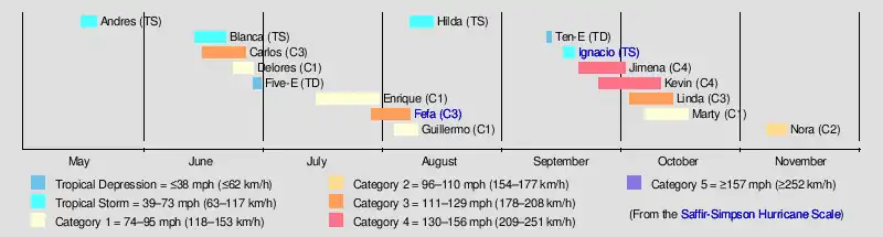 The 1991 Pacific hurricane season was a near-average Pacific hurricane season. The worst storm this year was Tropical Storm Ignacio, which killed 23 people in Mexico and injured 40 others. Elsewhere, Hurricane Fefa caused flooding in Hawaii. Hurricane Kevin was the strongest system of the season and became the then longest-lasting hurricane in the eastern north Pacific basin at the time, and Hurricane Nora was the strongest November storm to that point. The season officially started on May 15, 1991, in the eastern Pacific, and on June 1, 1991, in the central Pacific. It lasted until November 30, 1991, in both basins. These dates conventionally delimit the period of each year when most tropical cyclones form in the northeastern Pacific Ocean.