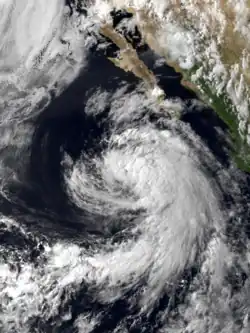 On November 7, an area of convection associated with a tropical wave developed into a tropical depression, while located about 560 mi (900 km) to the southeast of Acapulco, Mexico.[42] During that day the depression moved towards the northwest, intensified into a tropical storm and was named Nora later that day.[43][44] On the next day, the storm gradually intensified further while temporarily moving towards the west, due to the flow field around a strengthening high pressure system located to the north of Nora.[1] After developing an eye, Nora intensified into a hurricane.[42][45]
