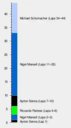 By the time Thierry Boutsen spun off on lap 28, the track was beginning to dry, which meant Senna's gamble had failed, and the subsequent pit stop dropped him back down to twelfth. He then made a charge through the field, passing Mika Häkkinen's Lotus for fifth on the penultimate lap. Johnny Herbert retired once again with engine problems on lap 43, and was classified 13th. Schumacher took his first Grand Prix win for Benetton by a comfortable margin over both the Williamses of Mansell and Patrese after they both suffered engine problems in the closing laps (Mansell with a broken exhaust). The Williams duo were able to finish second and third ahead of Brundle in the other Benetton, Senna in the remaining McLaren and Häkkinen in the remaining Lotus securing the final point. Eighteen cars were classified as finishers, the highest number for the season.[12] In what was his 18th race a year after his debut in 1991, Schumacher achieved his first Grand Prix win, the first of 91 career wins, and the first of a record six-Belgian Grand Prix wins.[13][14][15]