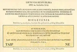 A referendum on the withdrawal of Soviet troops was held in Lithuania on 14 June 1992.[1] Voters were asked whether Soviet troops (which by the time of the referendum had become Russian troops)[2] should unconditionally and immediately withdraw from the country.[2] It was approved by 93% of those voting and 69% of all registered voters, passing the 50% threshold.[2][3]