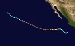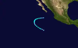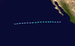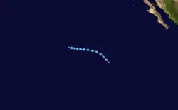 Although the eye briefly disappeared from satellite imagery later that day,[33] a small and distinct eye quickly re-formed within very deep convection, and Estelle was respectively upgraded into a Category 2 hurricane.[34] Later on July 11, the NHC reported that Estelle had intensified into a major hurricane.[6] A few hours later, Estelle was upgraded into a Category 4 system as the storm continued to rapidly deepen.[35] Moving northwestward due to interaction with a trough,[36] Estelle began a weakening trend. By the afternoon, Estelle was downgraded into a Category 3 system. At 00:00 UTC, winds fell below major hurricane force, only to re-intensify back to a major hurricane hours later.[6] Hurricane Estelle quickly re-developed a well-defined eye and an impressive upper-level outflow[37] and Estelle attained its peak intensity of 140 mph (230 km/h).[6] However, the next day the thunderstorms around the eye began to warm.[38] The storm gradually weakened over the next few days as it encountered cooler waters.[29] By early on July 14, Hurricane Estelle was re-classified as a Category 3 hurricane, and shortly afterwards, winds fell below major hurricane strength several hundred miles west of the Baja California Peninsula.[6] Turning west under shallow low-level steering currents,[29] Estelle weakened into a tropical storm on July 15. It weakened into a tropical storm the next day. On 08:00 UTC July 17, Tropical Depression Estelle had dissipated over 1,000 mi (1,610 km) west of Baja California Sur.[6]