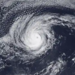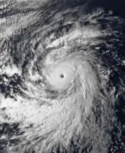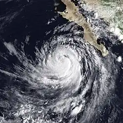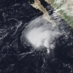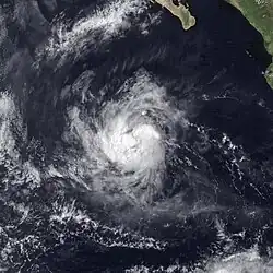 Late on July 15, Hurricane Frank passed about 175 mi (282 km) south of Socorro Island. A station on the island reported winds of 67 mph (108 km/h), which indicated that the hurricane had a large wind field.[42] Slow intensification continued, and Frank intensified into a major hurricane, or a Category 3 on the Saffir-Simpson Hurricane Scale, on July 17.[6] By that time, the eye had become well-defined,[43] and later became surrounded by a ring of deep convection. On July 18, Frank reached its peak intensity of 145 mph (233 km/h) well to the west-southwest of the Baja California peninsula.[44] By July 20, winds dropped below major hurricane intensity, and by the evening, Frank was just a Category 1 hurricane.