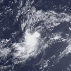 The origins of Hurricane Estelle were from a tropical wave that began on June 23 off the African coast.[29] After passing over northern South America, a large area of disturbed weather formed about 460 mi (740 km) west of Acapulco on July 9 and was classified as a tropical depression two days later. Eighteen hours later, the depression strengthened into Tropical Storm Estelle[29] as banding features increased.[30] Gradually intensifying, the storm's outflow improved,[31] and a burst of deep convection occurred over the center.[32] Early on July 10, an eye developed, and based on this, Estelle was upgraded into a hurricane. Around that time, Estelle turned to the northwest.[29]