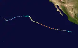 During the season, twenty-seven tropical cyclones formed in the Eastern Pacific (east of longitude 140°W), and twenty-four developed further and became tropical storms. Both of these figures constitute records in the basin, as the 1992 season surpassed the season with the most tropical cyclones (1982, 26) and the season with the most named storms (1985, 22). Of these, fourteen reached hurricane strength and eight became major hurricanes—storms that reach Category 3 or higher on the Saffir-Simpson Hurricane Scale.[5]