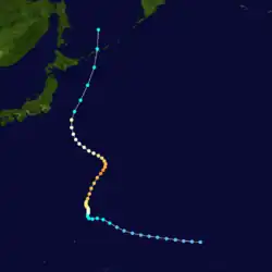 Early the next day, Bobbie intensified into a severe tropical storm.[9] At that time, the JTWC claimed that Bobbie had intensified into a typhoon,[9] while the JMA noted that Bobbie had actually became a typhoon several hours later.[5] On 18:00 UTC on 26 June, Bobbie peaked with 1-minute sustained winds of 140 mph (220 km/h) as it tracked the western extent of the mid-level subtropical ridge.[9] Several hours later, Bobbie peaked with 10-minute sustained winds of 105 mph (165 km/h).[5] As Bobbie began recurving east of Taiwan at 12:00 UTC that day, increasing southwesterly winds caused Bobbie to steadily weaken. Passing over Miyako Jima on 28 June and then just southeast of Okinawa on 29 June, Bobbie began undergoing an extratropical transition on at that time.[9] At that time, Bobbie weakened into a severe tropical storm as it left the PAR, causing PAGASA to stop issuing advisories on the storm.[9] As Bobbie transitioned into an extratropical storm, the JTWC issued their final warning on the system the next day, prior to it brushing the southern tip of Honshu.[9] The JMA noted that Bobbie became extratropical early the next day, prior to it dissipating on 3 July.[5]
