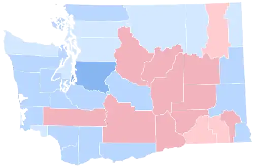 As of the 2024 presidential election, this is the last election in which Okanogan County has voted for a Democratic Presidential nominee.[4] It was also the first occasion since Franklin D. Roosevelt’s 1936 landslide that Whitman County had supported a Democratic presidential candidate, as well as the first time that King County was the most Democratic in the state, a trend that has continued in every presidential election since.[5]