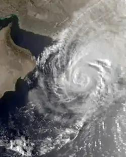 On November 5, the JTWC first monitored an area of convection southwest of India, associated with the Intertropical Convergence Zone. On November 8, the IMD classified the storm as a depression, giving it the identifier ARB 01. The depression moved northeastward toward southern India, moving ashore near Thoothukudi on November 9, and soon degenerated into a remnant low-pressure area. The remnant low of the storm turned back to the northwest and re-emerged into the Arabian Sea. On November 12, it re-intensified into a depression, after convection increased over the center, and the IMD gave the storm a new identifier, ARB 02. Later that day, the JTWC classified the system as Tropical Cyclone 01A. As the storm turned to the north and northeast, it intensified further, based on observations from two ships. The IMD upgraded it to a very severe cyclonic storm on November 14, estimating peak winds of 120 km/h (75 mph). The JTWC estimated higher wind speeds of 150 km/h (95 mph). Wind shear from the westerlies displaced the convection, which continued ahead of the circulation. The center of the storm slowed and turned to the southeast as the winds quickly diminished. By November 16, the system weakened into a remnant low-pressure area off the coast of Gujarat and Sindh.[3][2]