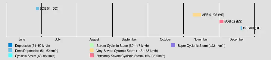 | ARB 01/02 | November 8–16 | Very Severe Cyclonic Storm | 120 km/h (75 mph) | 986 hPa (29.12 inHg) | India, Pakistan | Unknown | 644 | [2][11] |