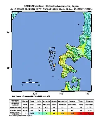 The 1993 southwest-off Hokkaido earthquake (北海道南西沖地震, Hokkaidō Nansei Oki Jishin) or Okushiri earthquake occurred at 13:17:12 UTC on 12 July 1993 in the Sea of Japan near the island of Hokkaido.[2] It had a magnitude of 7.7 on the moment magnitude scale and a maximum felt intensity of VIII (Severe) on the Mercalli intensity scale. It triggered a major tsunami that caused deaths on Hokkaidō and in southeastern Russia, with a total of 230 fatalities recorded. The island of Okushiri was hardest hit, with 165 casualties from the earthquake, the tsunami and a large landslide.[3]