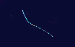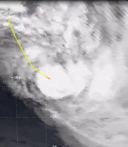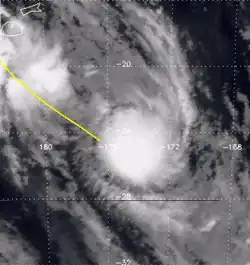 On December 30, the FMS reported that a tropical depression had developed about 860 km (535 mi) to the northeast of Pago Pago in American Samoa.[15] Over the next couple of days, the system moved towards the south-southeast and gradually developed further before the NPMOC designated the depression as Tropical Cyclone 05P.[11][5] During January 1, TCWC Nadi reported that the depression had developed into a Category 1 tropical cyclone and named it William as it passed near the Cook Island of Autitaki.[5] During the next day, William subsequently slowly accelerated as it passed near to or over several other Cook Islands and intensified into a Category 2 tropical cyclone.[5]