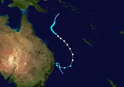A persistent cloud mass east of the Solomon Islands evolved into a tropical depression on November 12, according to the FMS.[8][4] Located about 245 km (150 mi) northeast of Tikopia, the system had gale-force winds developing on its southern side.[8][9] The depression moved south-eastwards at first, before it turned southwestwards through Temotu Province towards Vanuatu, which prompted the FMS to start issuing special weather bulletins for the island nation during November 13.[8][9][10] Later that day, the JTWC initiated advisories, designating it Tropical Cyclone 01P. On November 14, the FMS named the system Vania, after it had become a category 1 tropical cyclone on the Australian scale.[8][9][11] Intensifying further, Vania moved through northern Vanuatu on November 15 as a category 2 tropical cyclone.[9] Later that day, the FMS predicted that Vania would become a hurricane and issued a hurricane warning; however, Vania had peaked as a category 2 tropical cyclone with peak 10-minute sustained windspeeds of between 100 km/h (65 mph), while the JTWC estimated that the system had peaked with 1-minute sustained windspeeds of 110 km/h (70 mph).[9][11][8] Over the next couple of days, the system stalled and started to move westwards, before the FMS and JTWC issued their final advisories on the cyclone during November 18, as it had weakened below tropical cyclone intensity and degenerated into a sheared depression to the north of New Caledonia.[8][9][11] The remnant low-level circulation was last noted during November 19, while they were located about 80 km (50 mi) to the west of Port Vila.[9]