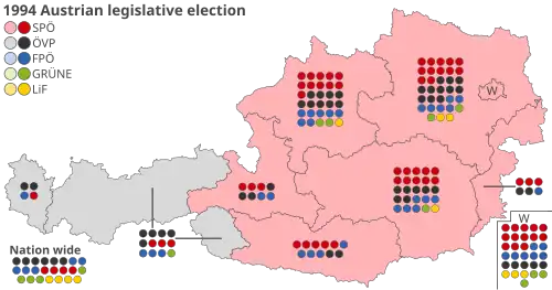Parliamentary elections were held in Austria on 9 October 1994.[1] The Social Democratic Party of Austria (SPÖ) and Austrian People's Party (ÖVP) remained the largest parties, but both suffered losses to minor parties. The Freedom Party of Austria (FPÖ) improved to 22.5% and The Greens won 7.3%. The Liberal Forum, a liberal splinter from the FPÖ, won 6.0% and entered the National Council on its first attempt. The incumbent grand coalition of the SPÖ and ÖVP was renewed.[2]
