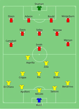 Arsenal were without their leading goalscorer Ian Wright, who missed the final through suspension as well as the injured John Jensen, Martin Keown, and David Hillier.[5] Arsenal were fielding a starting midfield of Ian Selley, Steve Morrow and Paul Davis. The famous back five of Seaman, Dixon, Adams, Bould and Winterburn was safely in place but with Wright suspended, Alan Smith was given a lone role up front with Merson and Kevin Campbell instructed to play wide in a 4-5-1.