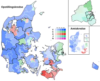 Seats were allocated first by the D'Hondt method to Electoral coalitions (Danish Social Liberal Party and Christian People's Party; Venstre, Conservative People's Party and Centre Democrats; June Movement and People's Movement against the EU) and the remaining parties by themselves; then subsequently between the parties in each coalition.