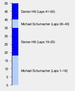 As the rain eased, it was decided to run the remainder of the race, with around one hour to the time limit, on aggregate corrected time. Schumacher had been leading by 6.8 seconds when the red flag was shown, but Hill had a bigger lead (10.1 seconds) at the chequered flag, and thus took the win by 3.3 seconds on aggregate. This remains the last instance of aggregate race time being used in Formula One to determine the winner.[6][7]