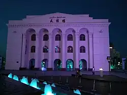 The Friendship Theatre was built in 1958 following Soviet architecture,[4] renovated starting in 1989 and reentered operation in December 1991. The building had three floors and was originally designed with a capacity of 796 people. The renovation increased it to 810. The soundproofing material was made of asbestos and polyurethane; the curtains were made of cotton. In certain positions, the spotlight was only at a distance of 20 cm from the stage curtains.[5] Due to a lack of awareness on fire safety, the refurbishments of the theatre introduced many flammable objects, such as the seats, which due to being made from artificial fibres, burned well, spread out toxic gasses and proved fatal in the fire to many people.[6]