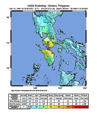 - ^ a b c d "M 7.1 – Mindoro, Philippines". United States Geological Survey. November 14, 1994. Retrieved August 31, 2017.